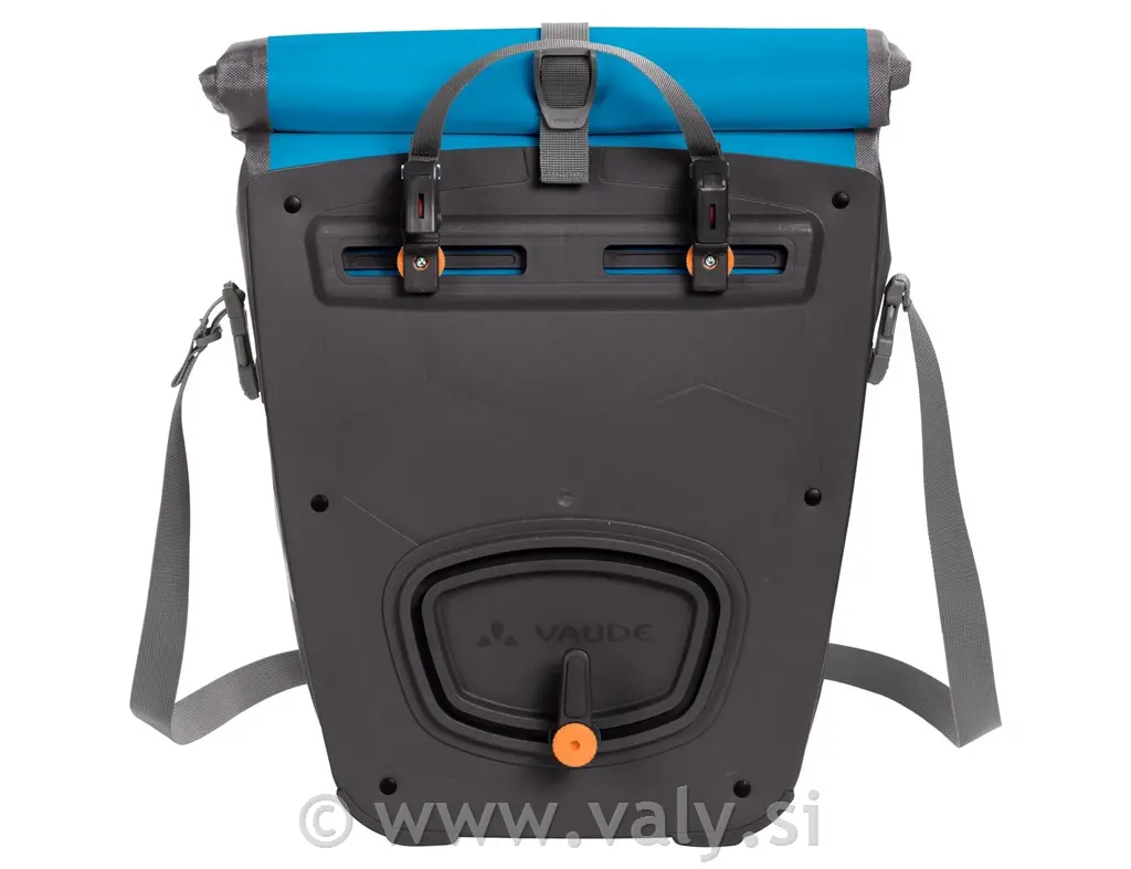 Zadnja potovalna kolesarska torba Vaude Aqua Back, narejena v Nemčiji. Ima prilagodljivo ( se "porola" ) zapiranje, kar omogoča, da si prilagodite velikost glede na potrebe, hkrati pa je 100% vodoodporna. Ker sta obe torbi simetrični jo lahko montirate na levo ali desno stran. Dodaten notranji žep omogoča boljšo razporeditev opreme.