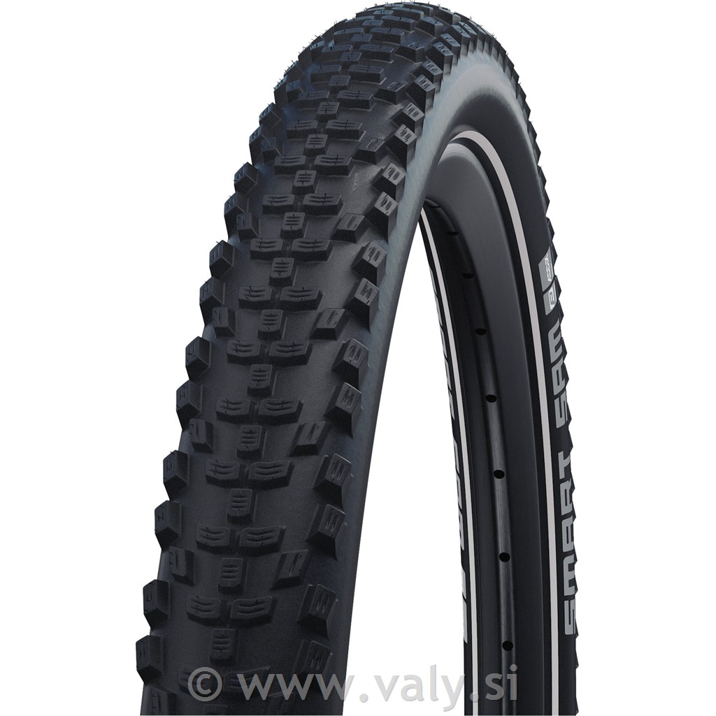 Schwalbe Smart Sam je 27.5" plašč za gorska kolesa. Eden boljših vsestranskih treking plaščev. Valy - Žagar kolesarski center Kranj. Trgovina in servis s kolesarsko opremo Kokrica pri Kranju. Vsako kolo potrebuje kolesarski plašč. Vsako kolo potrebuje kolesarski plašč. V naši trgovini Valy lahko kupite kolesarske plašče za gorsko kolo, cestno kolo in treking kolo. Kolesarski plašči, ki so na voljo so Schwalbe. To so vodilni proizvajalci na trgu in zagotovo zadovoljijo tudi najzahtevnejše kolesarje. Plašči Schwalbe imajo trenutno največjo izbiro plaščev za vse kolesarje. Kolesarski plašči so na voljo v različnih širinah in premerih. Kolesarske pnevmatike so cestne pnevmatike, treking pnevmatike, pnevmatike različnih velikosti in oprema za kolesa. Kolesarske pnevmatike se v prvi vrsti razlikujejo glede na kolo, ki ga uporabljate. V naši ponudbi so cestne pnevmatike, treking pnevmatike, mtb pnevmatike. Pnevmatike so različnih velikosti, širin in profilov, glede na tip kolesa in način vožnje. Prav tako je tudi oprijem. Plašč Schwalbe Smart Sam je eden boljših vsestranskih treking plaščev. Dober je na vsakem terenu. Lahkotno se vrti celo na cesti in ima hkrati dober oprijem na makadamu. Dober je na vsakem terenu.