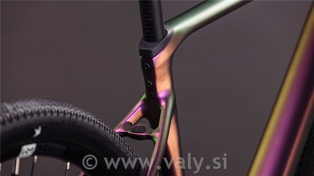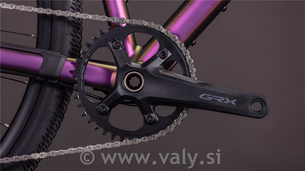 Za natančno in zanesljivo prestavljanje skrbi Shimano GRX 1x12 gravel pogonski sklop, posebej razvit za brezpotja in mešane podlage. Širok razpon prestav omogoča suvereno vožnjo tako po strmih klancih kot po hitrih ravninah. Newmen Performance X.R.25 obročniki imajo zmontirane Schwalbe G-One R pnevmatike širine 45 mm, okvir pa dopušča uporabo pnevmatik do 50 mm, kar dodatno poveča udobje in oprijem.