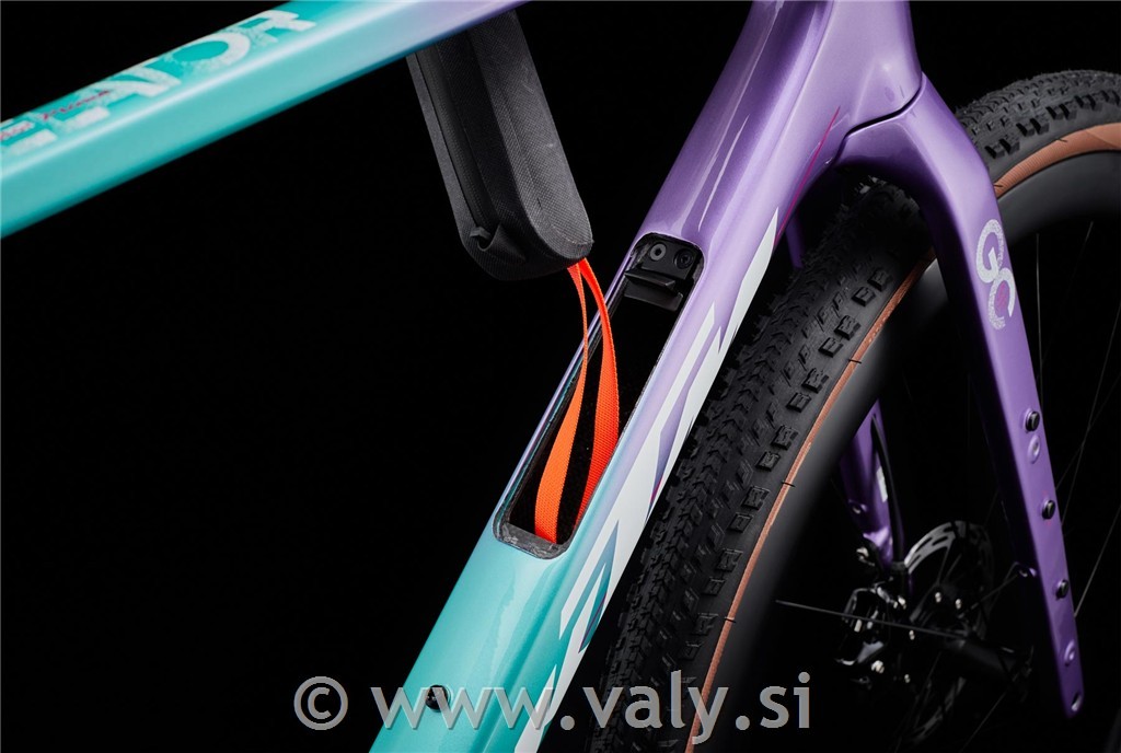 V srcu kolesa je karbonski okvir Gravelator Carbon z inovativnim sistemom FIS – Full Integrated Storage. Diskretno integriran prostor v spodnji cevi omogoča shranjevanje orodja, prigrizkov ali rezervnih delov – varno, praktično in vedno pri roki. Okvir prinaša veliko udobja, uravnotežen položaj na kolesu ter natančno in agilno vodljivost.